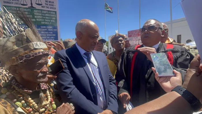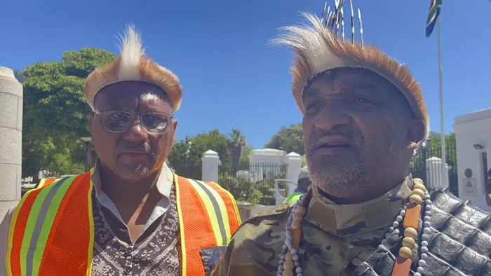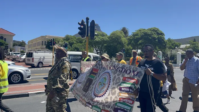 King Cornelius Botha, from United Sovereign Cape Kingdom (USCK), and members walk away from parliament after delivering a memorandum.