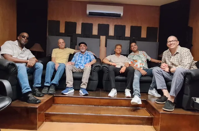 Mother City Vibes contributors MJ and the Camissa Knights, from left, Peter Ndlala on bass guitar, George Werner on keyboard and arrangement, composer Mansoor Jaffer on guitar, Uviwe Caso on guitar, Muneeb Hermans on trumpet, and Carlo Fabe on drums.