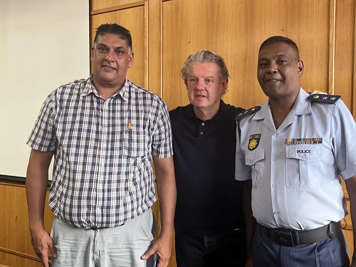 CPF chairman Marc Truss, centre congratulates newly promoted Colonel Rajsingh Lutchman, left, section commander for detectives, and Colonel Kevin Stephens, right, station Visible Policing Commander. Both officers, formerly lieutenant colonels, received R500 grocery shopping vouchers sponsored by the CPF.